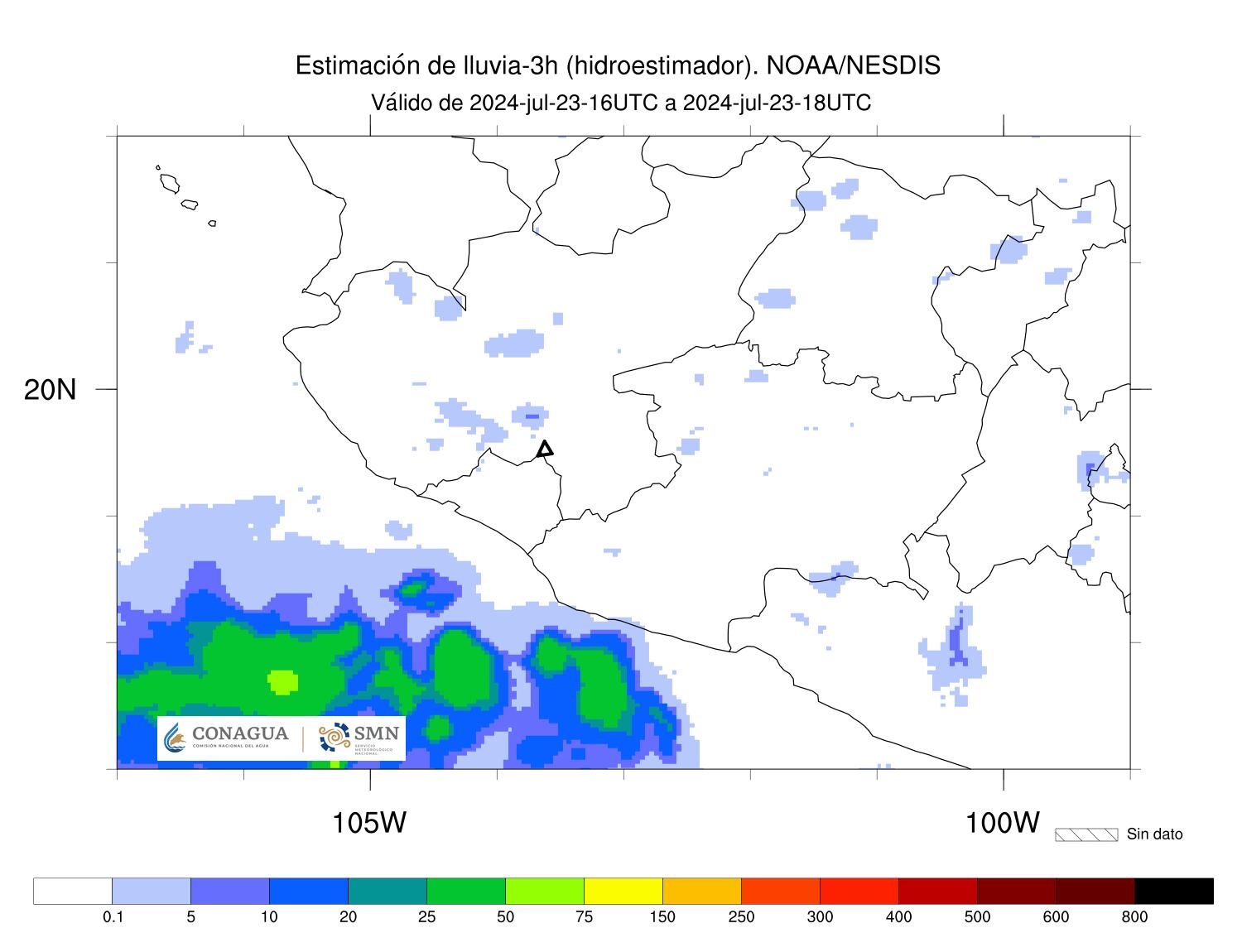 Hay presencia de nubosidad en la zona del volcán, por lo que se obstaculizaría la detección satelital en caso de alguna actividad, (Imagen 2). La estimación satelital de lluvia no presenta precipitación acumulada sobre la zona del volcán en las últimas tres horas, esto con corte a las 12:00 h de hoy, hora local (Imagen 3).