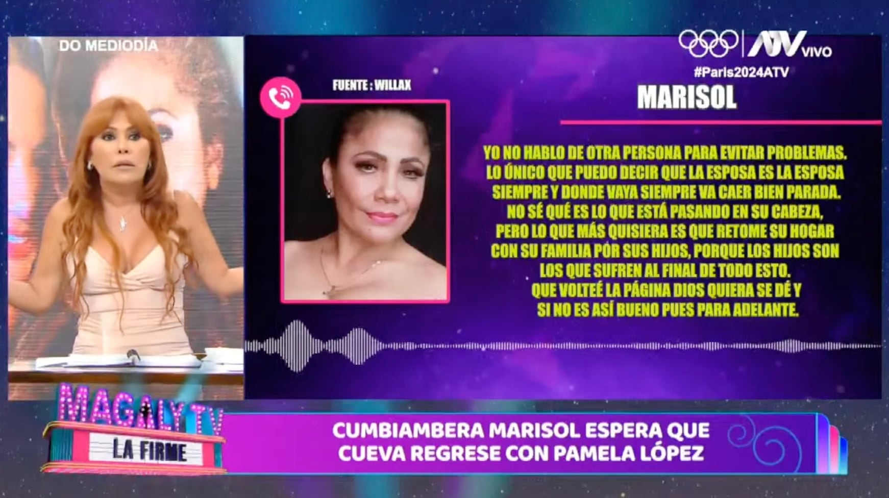 Consultada por Amor y Fuego sobre la situación que enfrentan Cueva y López, Marisol señaló que espera que pasen la página y se perdonen por sus hijos. Magaly Medina no tomó nada bien estas palabras.