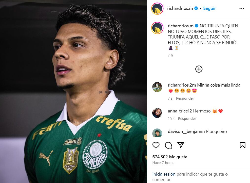 “No triunfa quien no tuvo momentos difíciles. Triunfa aquel que pasó por ellos, luchó y nunca se rindió”, escribió Ríos en la descripción que acompaña a la instantánea. Este mensaje de perseverancia y resiliencia ha resonado profundamente entre sus seguidores, quienes valoran tanto su destreza futbolística como su actitud inspiradora.