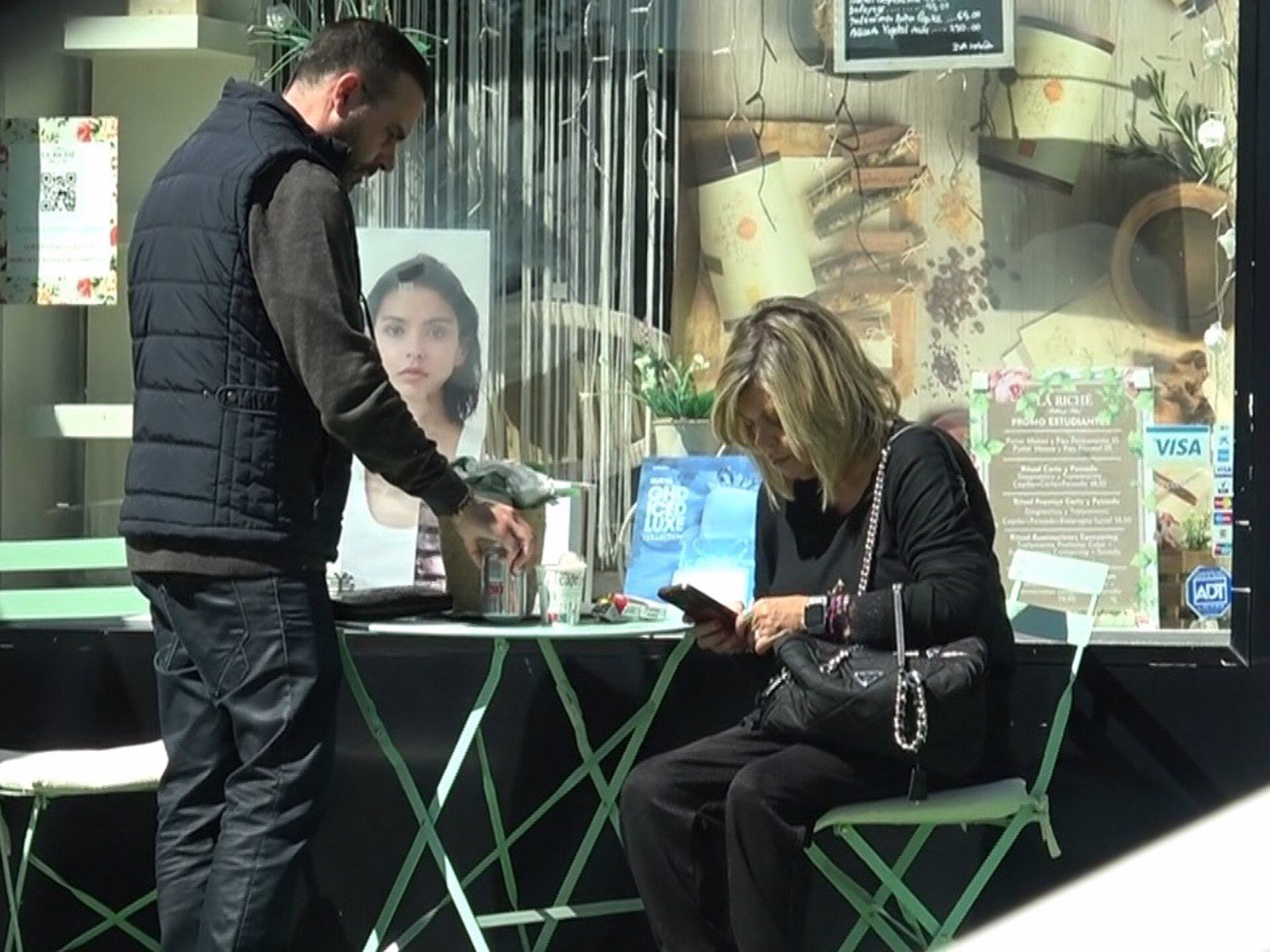 Ajena a la presencia de cámaras grabando la escena, Terelu se ha sentado en una terraza a consultar su teléfono móvil mientras su chófer iba a buscarle su refresco favorito antes de ir a un centro de belleza a ponerse a punto para el gran día.