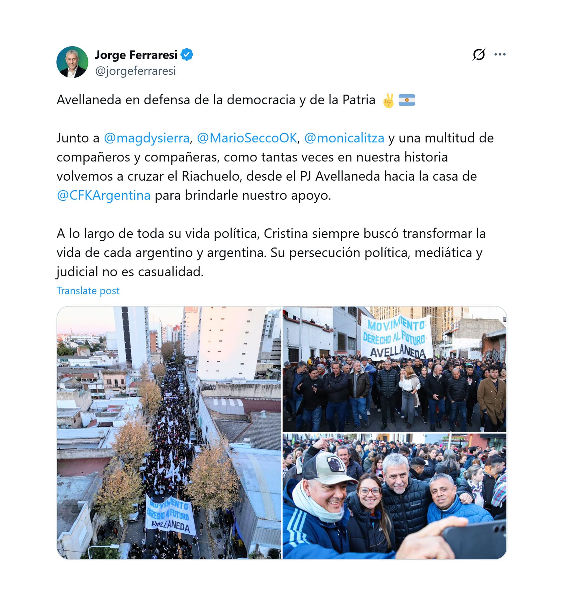 La última columna que partió hacia allí estuvo encabezada por el intendente de Avellaneda, Jorge Ferraresi. Rodeando de dirigentes y banderas de diferentes agrupaciones, el jefe comunal caminó desde ese enclave de la provincia de Buenos Aires y se sumarán a la concentración que rodea el domicilio de CFK en la Ciudad de Buenos Aires. Junto a él caminó Mario Secco, intendente de Ensenada. Las imágenes en redes sociales circularon con insistencia en la segunda mitad de la tarde del miércoles 11 de junio con leyendas del tipo “despertaron al peronismo”.
