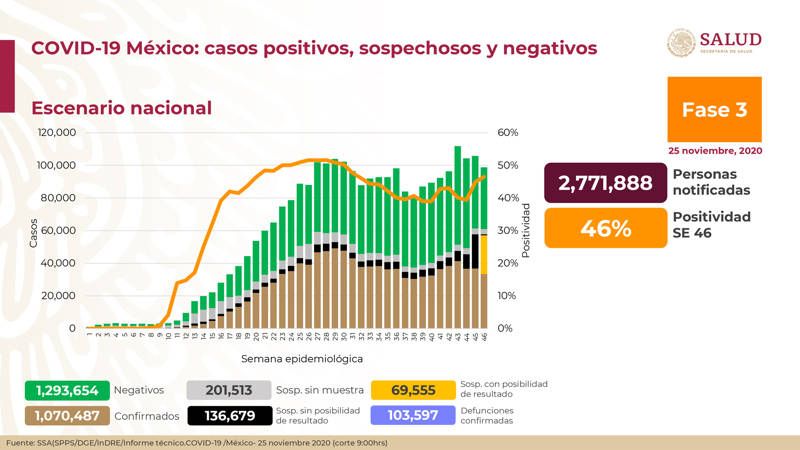 En México hay 1 millón 070 mil 487 casos confirmados de Covid Autoridades de la Secretaría de Salud informaron esta noche en conferencia de prensa que al 25 de noviembre de 2020 hay 1,070,487 casos confirmados de Covid-19.