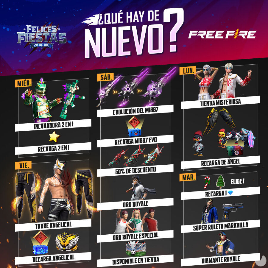 com/3W3Lyfz3as— Garena Free Fire LATAM 📱 (@freefirelatino) December 13, 2022 Agenda semanal del 14 al 20 de diciembre de Free Fire: Todos los contenidosEstas son todas las novedades y contenidos que agrega Free Fire y Free Fire MAX en su agenda semanal del 14 al 20 de diciembre:Miércoles, 14 de diciembre: Incubadora 2 en 1 y Recarga 2 en 1.