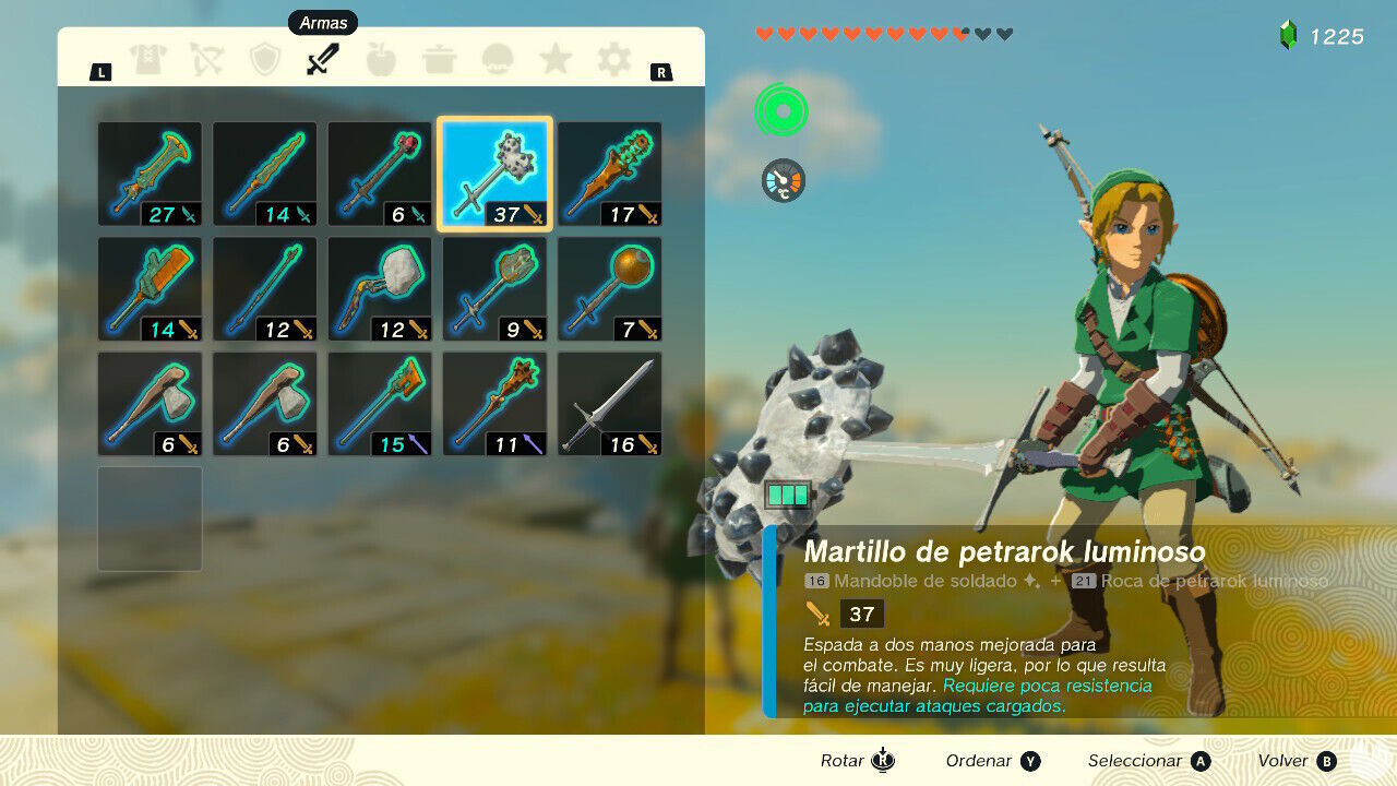 Ahora selecciona y equipa en las manos de Link el arma que quieras duplicar (nosotros escogimos para este caso un Martillo de petrarok luminoso).