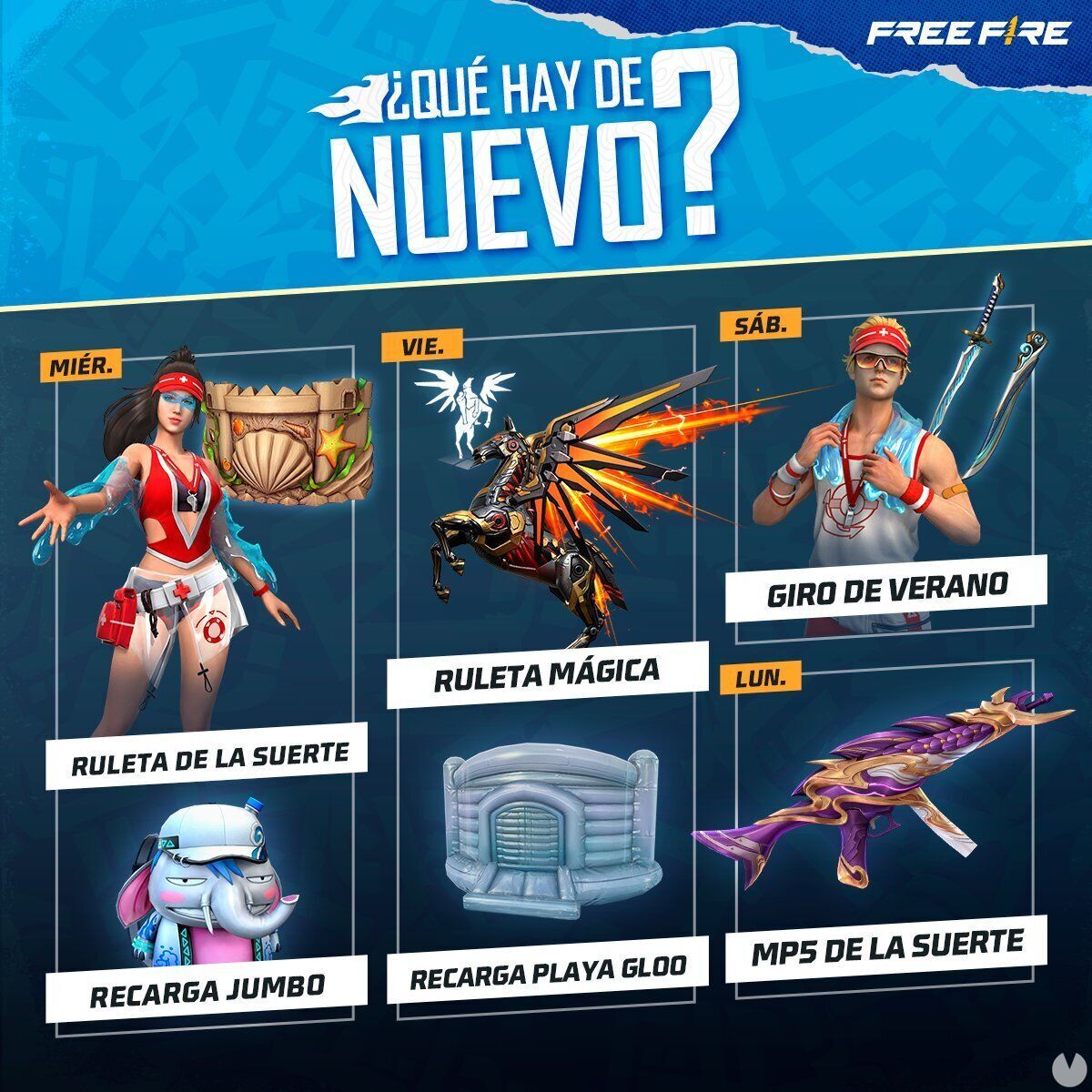 com/DtadhOyYMS— Garena Free Fire LATAM (@freefirelatino) June 20, 2023 Agenda semanal del 21 al 26 de junio de Free Fire: Todos los contenidosEstas son todas las novedades y contenidos que agrega Free Fire y Free Fire MAX en su agenda semanal del 21 al 26 de junio:Miércoles, 21 de junio de 2023: Ruleta de la Suerte y Recarga Jumbo.