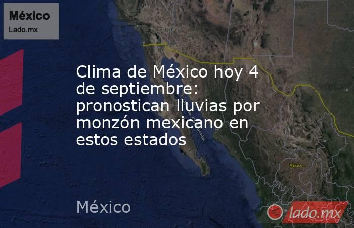 Prepara el paraguas porque las lluvias no paran en México, el Sistema Meteorológico Nacional (SMN) informó que para hoy lunes 4 de septiembre gran parte del territorio mexicano se cubrirá por lluvias que van desde intensas hasta aisladas, condiciones que se generan debido al monzón mexicano situado en el noroeste y las ondas tropicales 25 y 26 que se desplazarán por el occidente.