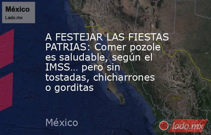 - En estas Fiestas Patrias comer pozole no debe ser motivo de culpa, pues el Instituto Mexicano del Seguro Social (IMSS) dio a conocer que el platillo típico del país es completo en nutrientes y que además no contribuye a subir de peso, pero recomendó evitar los complementos que lo acompañan, publicó El Heraldo de México.