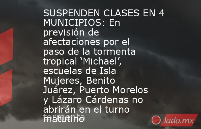 - Suspendió el Gobierno del Estado las clases mañana en el turno matutino en cuatro municipios, en todos los niveles, derivado del paso de la Tormenta Tropical “Michael”.
