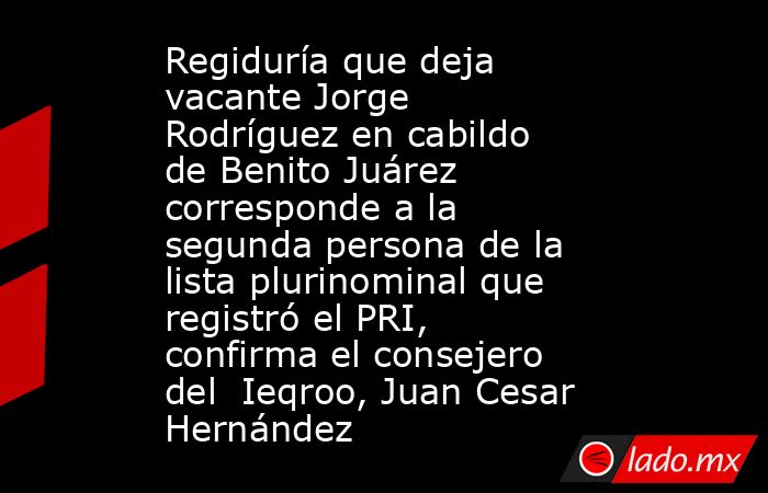 – Tras la consulta hecha por el ayuntamiento de Benito Juárez de quién es la persona que debe ocupar el espacio que deja vacante el regidor del PRI, Jorge Rodríguez Méndez, el consejero del Instituto Electoral de Quintana Roo (Ieqroo), Juan Cesar Hernández Cruz explicó que, de acuerdo con la […]The post Regiduría que deja vacante Jorge Rodríguez en cabildo de Benito Juárez corresponde a la segunda persona de la lista plurinominal que registró el PRI, confirma el consejero del Ieqroo, Juan Cesar Hernández appeared first on Noticaribe.