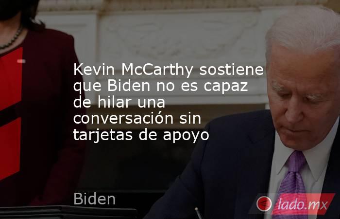 Kevin McCarthy, expresidente de la Cámara de Representantes, afirma que, a puerta cerrada, Joe Biden es incapaz de sostener una conversación sobre polÃtica a menos de que se apoye en tarjetas con información previa al respecto, pues de lo contrario se pierde al abordar casi cualquier tema