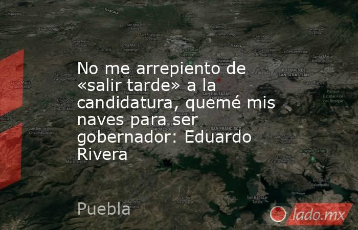 El candidato de la coalición “Mejor Rumbo para Puebla” a la gubernatura de Puebla, Eduardo Rivera Pérez, afirmó en una reunión con medios de comunicación que no se arrepiente de haber «salido tarde» a la candidatura, destacando que fue necesario corregir el rumbo de la ciudad sin apoyo financiero de la federación.