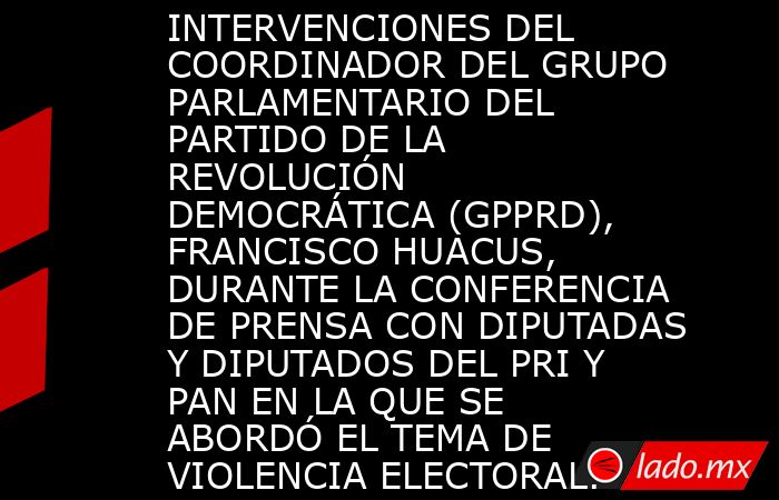 INTERVENCIONES DEL COORDINADOR DEL GRUPO PARLAMENTARIO DEL PARTIDO DE LA REVOLUCIÓN DEMOCRÁTICA (GPPRD), FRANCISCO HUACUS, DURANTE LA CONFERENCIA DE PRENSA CON DIPUTADAS Y DIPUTADOS DEL PRI Y PAN EN LA QUE SE ABORDÓ EL TEMA DE VIOLENCIA ELECTORAL.