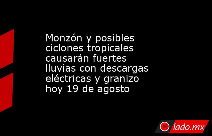 Para este lunes 19 de agosto, el Servicio Meteorológico Nacional (SMN) pronostica lluvias de distintas intensidades con fuertes vientos, descargas eléctricas y granizo en gran parte del país debido al monzón mexicano, una serie de canales de baja presión y la próxima llegada de la Onda Tropical 17 por la Península de Yucatán; sin embargo, pese a estas condiciones se espera ambiente caluroso en en el norte del país, con temperaturas superiores de hasta 45 grados.