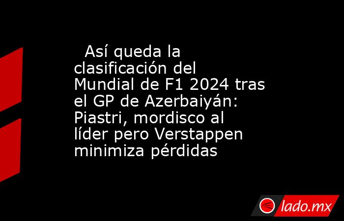 Seguimos descontando el número de carreras que quedan para el final, y Max Verstappen continúa minimizando daños en la clasificación del Mundial de F1 2024 tras el GP de Azerbaiyán: Max se mantiene líder con 59 puntos sobre un Lando Norris que volvió a desaprovechar una enorme oportunidad para acercarse mucho más a la lucha por el Mundial. Llegaba a 62 a esta pista y podía salir de ella mucho más cerca. Pero no pudo lograrlo.