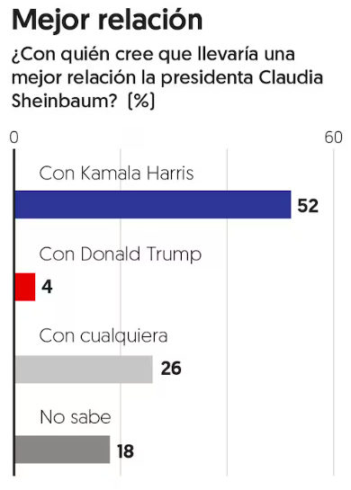 Según el estudio, el 52% cree que la mandataria mexicana llevaría una mejor relación con Harris a la cabeza del gobierno estadounidense, mientras que 4% considera que tendría una mejor con Donald Trump, en candidato republicano, quien ya ha estado en la presidencia.