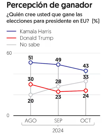 La encuesta señala que los mexicanos ven más probable que Kamala Harris se lleve el triunfo tras los comicios de este 5 de noviembre, sin embargo este pensamiento ha disminuido durante los últimos tres meses.