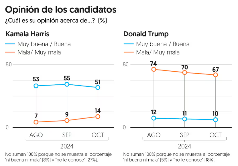 La opinión positiva sobre la candidata demócrata en México se mantuvo arriba del 50% de agosto a octubre, aunque sus negativos se duplicaron al pasar de 7% a 14%. Por otro lado, la opinión positiva sobre Trump se mantuvo entre 12% y 10%, mientras que la opinión negativa fue ligeramente a la baja.