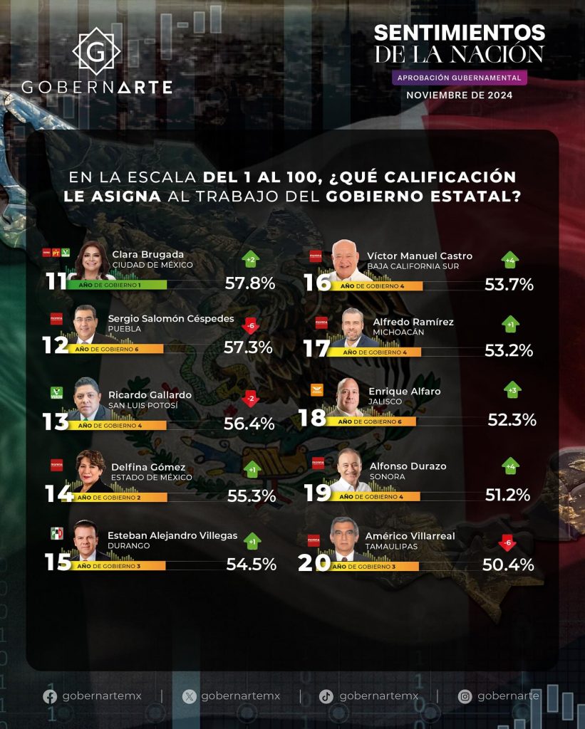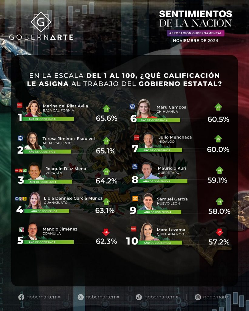 El top 10 incluye a los gobernadores que obtuvieron las calificaciones más altas en la encuesta de GobernArte. Estas cifras reflejan el respaldo ciudadano hacia su gestión en temas clave como seguridad, economía y bienestar social: