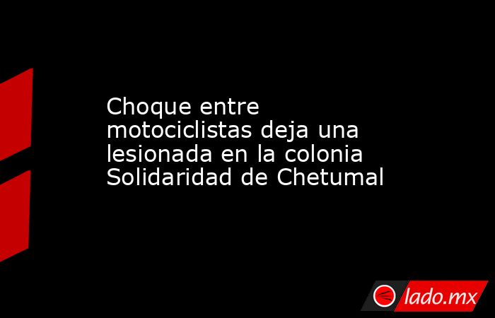 - Dos motociclistas protagonizaron esta tarde un choque frontal en la colonia Solidaridad de Chetumal, lo que dejó como saldo a una mujer conductora lesionada.