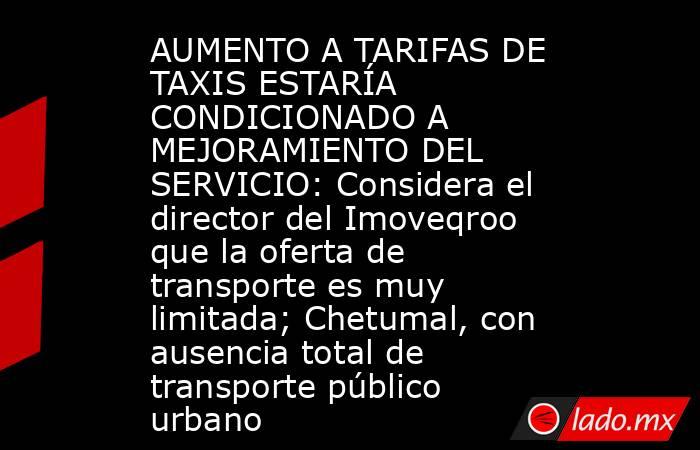 - Tras cuestionar la calidad del servicio de transporte público de pasajeros que se ofrece en sus diferentes modalidades en varios municipios de la entidad, el recién designado director del Instituto de Movilidad en Quintana Roo (Imoveqroo), Rafael Hernández Kotasek anticipó que la autorización o no de las solicitudes de aumento […]The post AUMENTO A TARIFAS DE TAXIS ESTARÍA CONDICIONADO A MEJORAMIENTO DEL SERVICIO: Considera el director del Imoveqroo que la oferta de transporte es muy limitada; Chetumal, con ausencia total de transporte público urbano appeared first on Noticaribe.