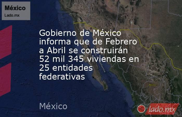 Durante la conferencia matutina: “Las mañaneras del pueblo”, el Gobierno de México informó que, como parte del Programa Nacional de Vivienda para el Bienestar, en los meses de febrero, marzo y abril se proyecta la construcción de 52 mil 345 viviendas en 25 entidades federativas.