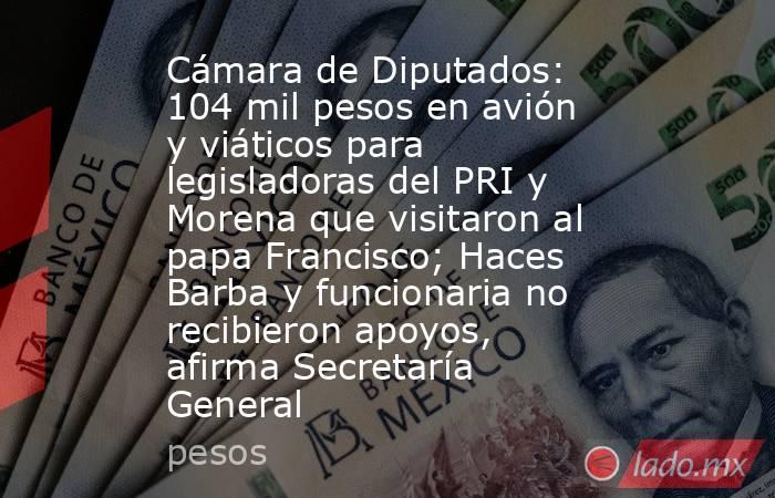 La Secretaría General de la Cámara de Diputados informó que la presidenta de la Comisión de Asuntos Migratorios, Marcela Guerra Castillo, del Partido Revolucionario Institucional (PRI), y la morenista Maribel Solache González, fueron apoyadas con 52 mil 123 pesos cada una para acudir a una audiencia privada con el papa Francisco.