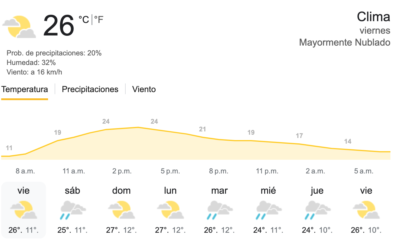 Se espera una noche nublada y la probabilidad de precipitaciones es del 20% por lo que no lloverá. Te recomendamos que lleves una prenda ligera para cubrirte porque a partir de las 21:00 horas comenzará a bajar la temperatura y podría llegar a los 17ºC.