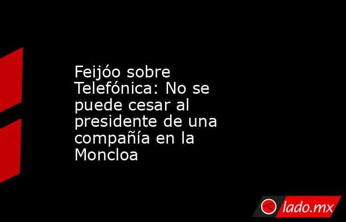 Valencia, 20 ene (EFE).- El presidente del PP, Alberto Núñez Feijóo, ha manifestado este lunes, sobre el relevo en la presidencia de Telefónica, que ningún gobierno "puede cesar" al presidente de una compañía cotizada o no cotizada "en el palacio de la Moncloa".