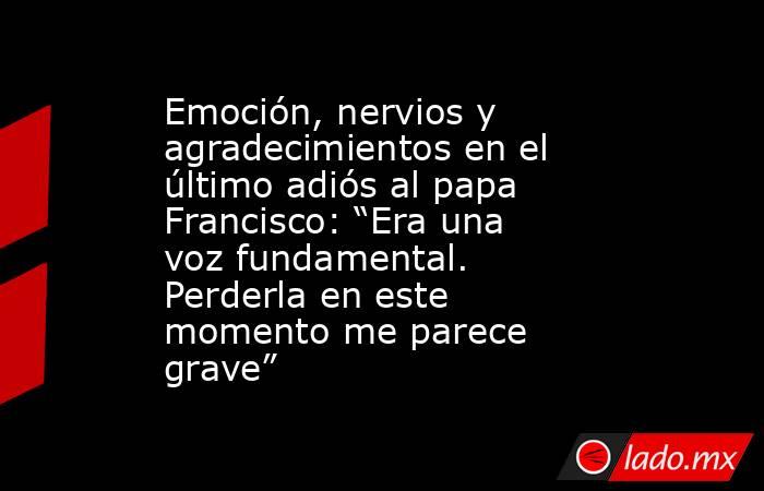 Josefina, de Argentina, estaba de turismo el domingo cuando fue a la plaza de San Pedro para asistir a la misa de Pascua. No sabía que sería la última vez que el mundo vería a Francisco con vida, pero la joven, de Buenos Aires, dice que experimentó un sentimiento “agridulce”. El papa no se movía casi, tenía la mirada fija, no interactuaba como antes. Tras su fallecimiento ha trascendido que Francisco le agradeció a su enfermero que le permitiera salir a saludar a los fieles en la Plaza de San Pedro pese a su frágil estado de salud.