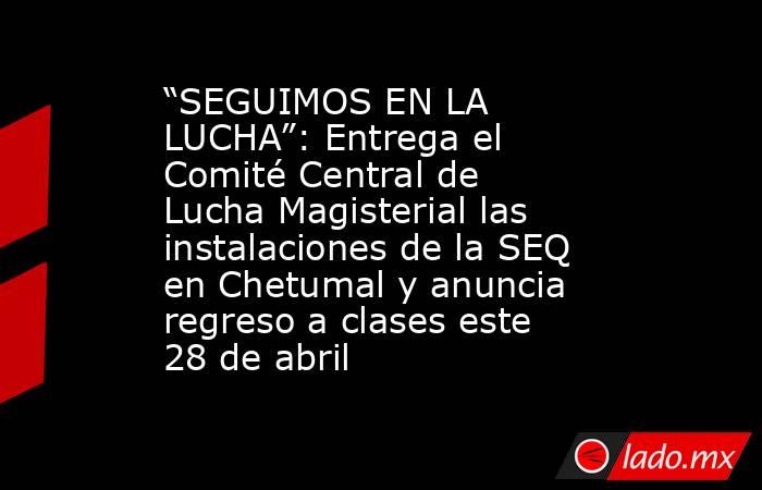 — Con una relación deteriorada por la actitud de la autoridad gubernamental, pero en aras de respetar el derecho humano a la educación que tienen los estudiantes, y tras 56 días de paro, esta mañana el Comité Central de Lucha Magisterial entregó de manera oficial las instalaciones de la Secretaría […]The post “SEGUIMOS EN LA LUCHA”: Entrega el Comité Central de Lucha Magisterial las instalaciones de la SEQ en Chetumal y anuncia regreso a clases este 28 de abril appeared first on Noticaribe.