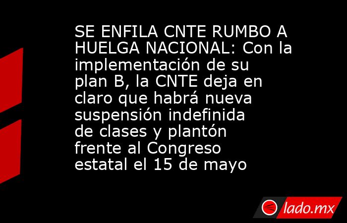 - Luego del anuncio de regreso a clases a partir de este 28 de abril en Quintana Roo, la Corriente Nacional de Trabajadores de la Educación (CNTE) pasó a su plan B para garantizar el respaldo de padres de familia ante la eventual huelga que iniciarán a partir del 15 de […]The post SE ENFILA CNTE RUMBO A HUELGA NACIONAL: Con la implementación de su plan B, la CNTE deja en claro que habrá nueva suspensión indefinida de clases y plantón frente al Congreso estatal el 15 de mayo appeared first on Noticaribe.