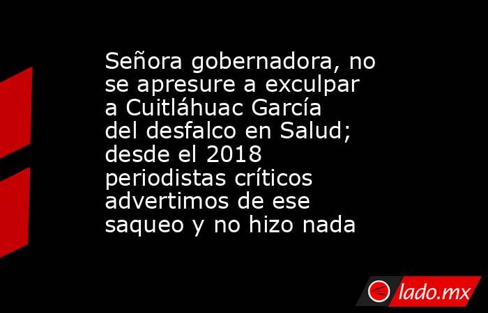 De todo eso se enteró el gobernador Cuitláhuac García, pero nunca inició una investigación y mucho menos la Contraloría puso interés en esos casos. Cuitláhuac García tenía razones para no hacer caso. Él sabía que su primo, Eleazar Guerrero, había colocado a los administradores en Salud y otras dependencias; el saqueo estaba institucionalizado. Por ello señora gobernadora, no se apresure a deslindar a Cuitláhuac García del desfalco en la Secretaría de Salud, no se apresure porque el señor, a sabiendas de lo que Jorge Eduardo Sisniega hacía en Salud, dejó que el saqueo ocurriera.