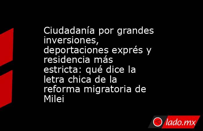 Como una novedad, la normativa crea una suerte de “ciudadanía por grandes inversiones”. Es un asunto que deberá ser elaborado en la reglamentación posterior, pero, a modo general, servirá para acelerar el proceso de ciudadanía para aquellos extranjeros que radiquen grandes inversiones en el país.