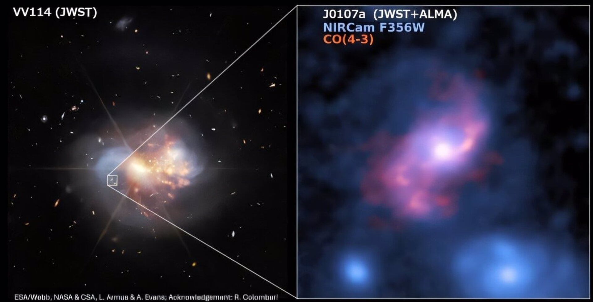 Las imágenes de infrarrojo cercano de VV114 obtenidas por el Telescopio Espacial James Webb en 2023 revelaron que J0107a es un ejemplo excepcionalmente masivo de galaxia monstruosa, con una masa diez veces mayor que la de la Vía Láctea y una tasa de formación estelar aproximadamente 300 veces mayor que la de la Vía Láctea.