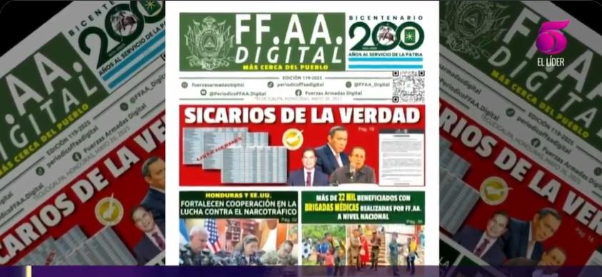 Digital, órgano oficial de las Fuerzas Armadas de Honduras, publicó e pasado 26 de mayo en portada un artículo titulado ‘Sicarios de la verdad’, acompañado de fotografías de los periodistas Rodrigo Wong Arévalo, director del programa ‘Abriendo brecha” y propietario de Canal 10; Dagoberto Rodríguez, director de Radio Cadena Voces y reciente ganador del Premio Álvaro Contreras 2025, y Juan Carlos Sierra, presidente del Colegio de Periodistas de Honduras (CPH).