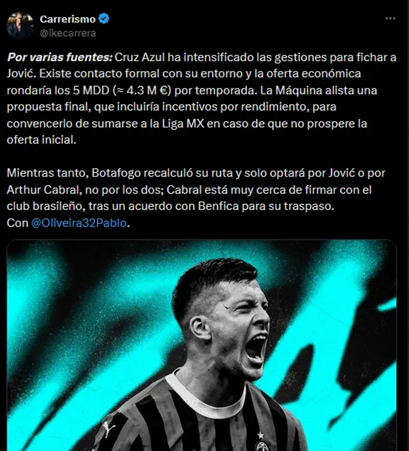 La información fue un verdadero bombazo: Cruz Azul estaría negociando con Luka Jóvic, quien está cerca de quedarse libre del Milan a fin de mes.