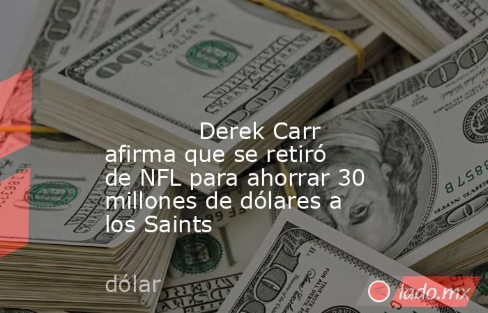 Derek Carr, veterano de 34 años, afirmó que se retiró del fútbol americano en mayo pasado para ahorrar a su exequipo, los New Orleans Saints, los 30 millones de dólares que le habrían tenido que pagar en la temporada 2025 de la NFL, a pesar de estar lesionado.