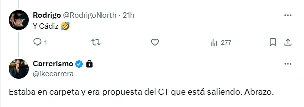 A través de su cuenta de X, el propio Ike Carrera confirmó que el nombre de Jhonder Cádiz ya no figura en la lista de prioridades de la directiva.