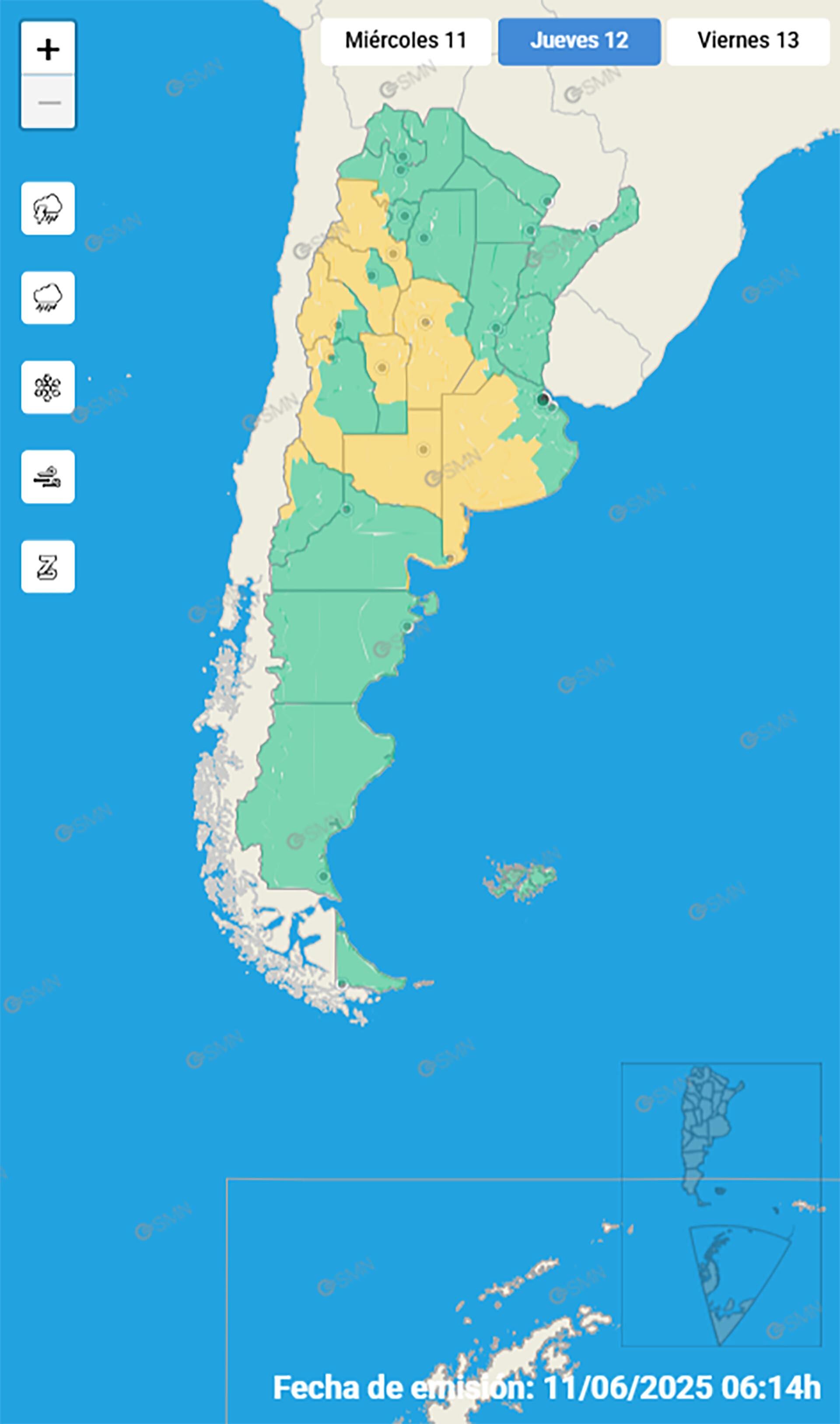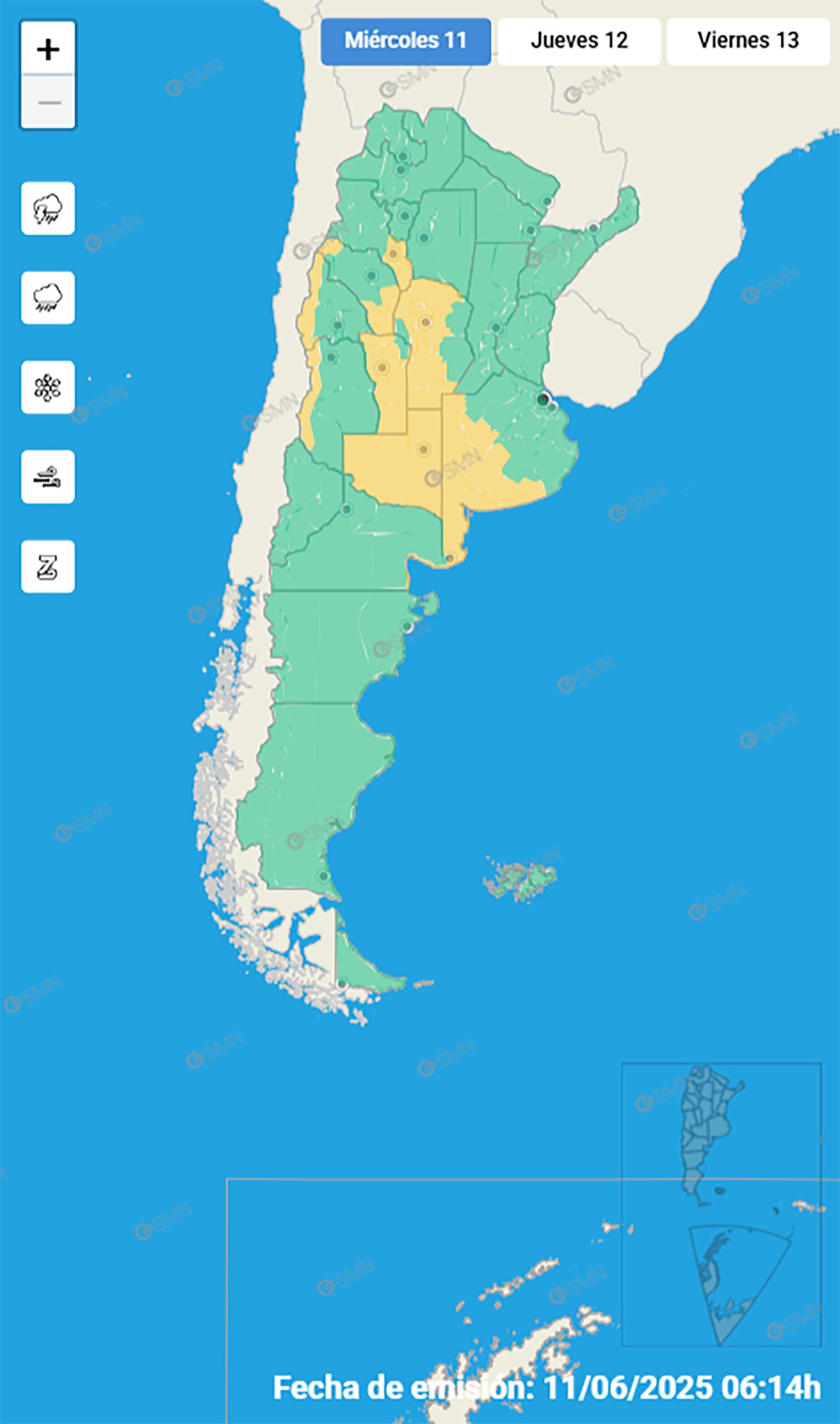 Además, mañana también hay una alerta amarilla por nevadas en la parte de la cordillera que involucra a San Juan, Mendoza y Neuquén. En estos casos, se solicita evitar las actividades al aire libre, retirar periódicamente la nieve acumulada en los techos, circular con vehículos adecuados y preparados para hielo y nieve. Y ventilar vehículos y viviendas para evitar acumulación de monóxido de carbono.