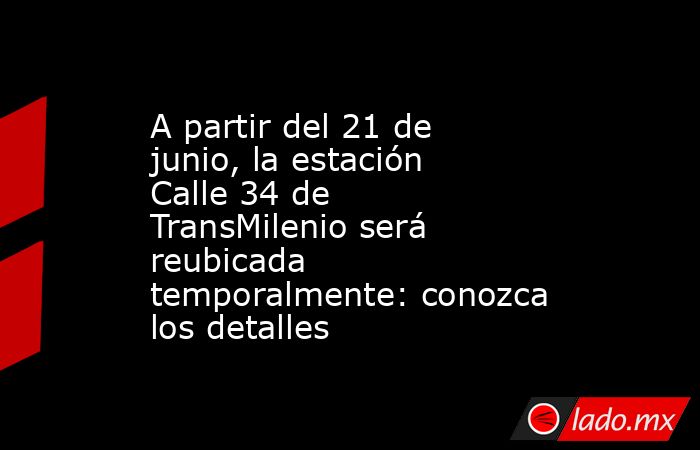 A partir del 21 de junio, la estación del sistema masivo de transporte de Bogotá, TransMilenio, Calle 34 será trasladada 20 metros al sur de la calle 32, con accesos habilitados desde el costado norte de la calle 32 y el costado sur de la calle 31, con el fin de darle paso a las obras de la Primera Línea del Metro que se está adelantando en la zona.