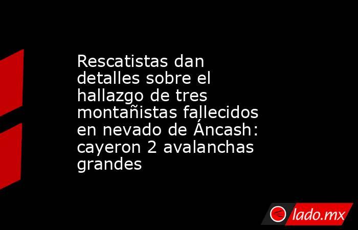Finalmente fueron hallados los cuerpos de los tres montañistas desaparecidos en el nevado Artesonraju y el equipo involucrado en su rescate confirmó que al menos dos avalanchas cayeron sobre el lugar donde fueron encontrados Hommer Pretel Alonzo (34) y Jesús Picón Huerta (31), estudiantes del Centro de Estudios de Alta Montaña (CEAM),junto al fotógrafo brasileño Edson Vandeira Costa.