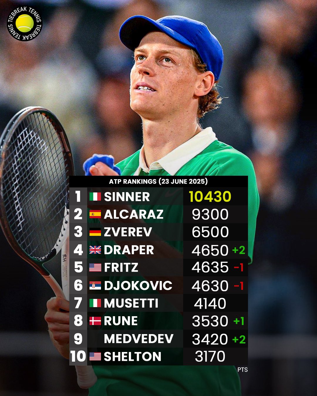 Además, Alexander Zverev llegará como cabeza de serie número tres a Wimbledon, mientras que Jack Draper, semifinalista en Queen’s, avanza dos puestos para situarse en el cuarto. Por su parte, Novak Djokovic cae al sexto puesto del ranking, y Daniil Medvedev (9), finalista en Halle, regresa al Top-10.