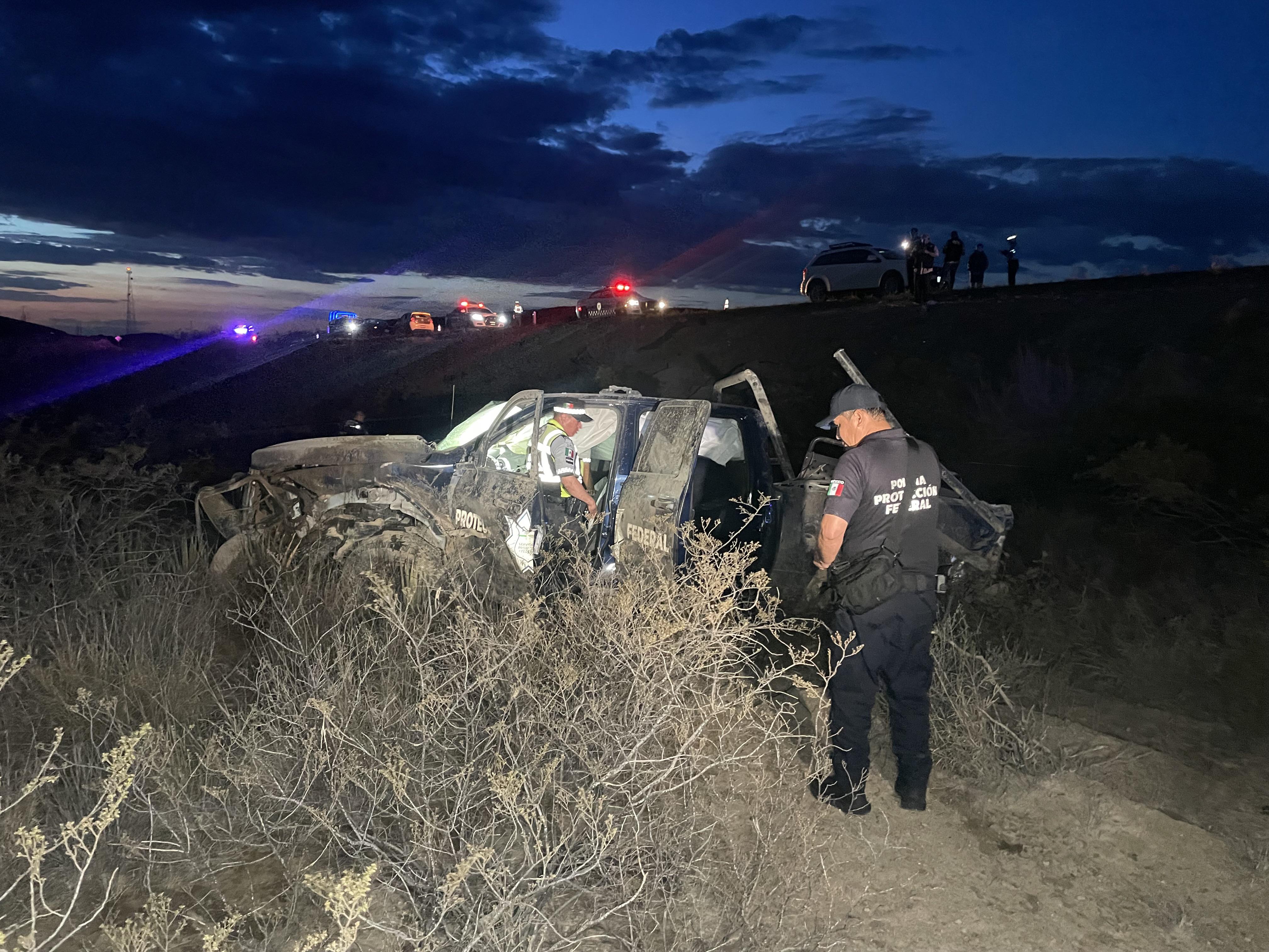 Fue a dar a un barranco, donde efectuó volteretas hasta que la patrulla quedó en posición normal, totalmente destruida.