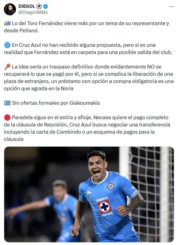 Asimismo, Diego Sánchez de One Football, informó en su cuenta de X que el cuadro cementero solo cedería al Toro Fernández en caso de que existiera la urgencia a la hora de liberar una plaza.