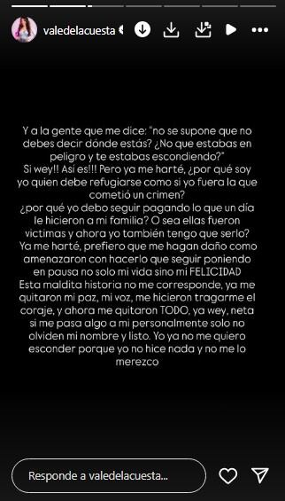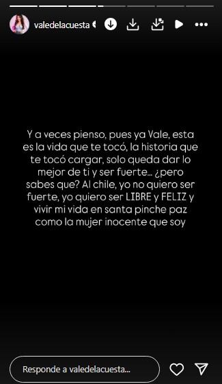 A lo largo de su publicación, Valentina reflexionó sobre cómo ha tenido que cargar con una historia que no eligió y cómo, a pesar de todo, su deseo es ser feliz y libre. “A veces pienso, ‘pues ya Vale, esta es la vida que te tocó, la historia que te tocó cargar, solo queda dar lo mejor de ti y ser fuerte’, pero… yo no quiero ser fuerte, yo quiero ser libre y feliz”, afirmó con firmeza, dejando claro que su principal objetivo es vivir en paz, como la mujer inocente que se considera.