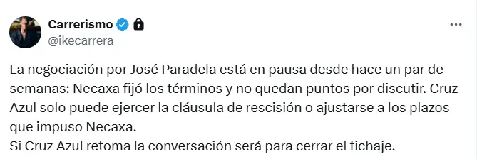 “Si Cruz Azul retoma la conversación será para cerrar el fichaje”, afirmó el reportero en el cierre de su mensaje posteado en X, tras enumerar las condiciones que tendría Necaxa y que suena a ultimátum en la carrera por intentar sumar a José Paradela como conductor de la nueva máquina cementera.