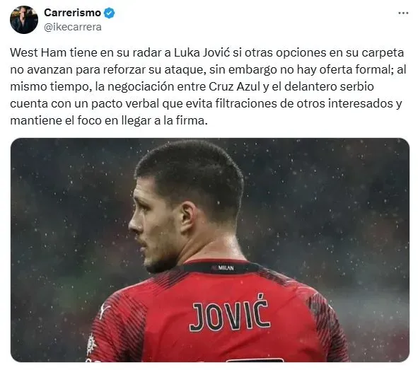 04 de Julio, 2025 10:01Aunque Cruz Azul habría llegado a un acuerdo con Luka Jovic, apareció un fuerte equipo de la Premier League interesado en el serbio.