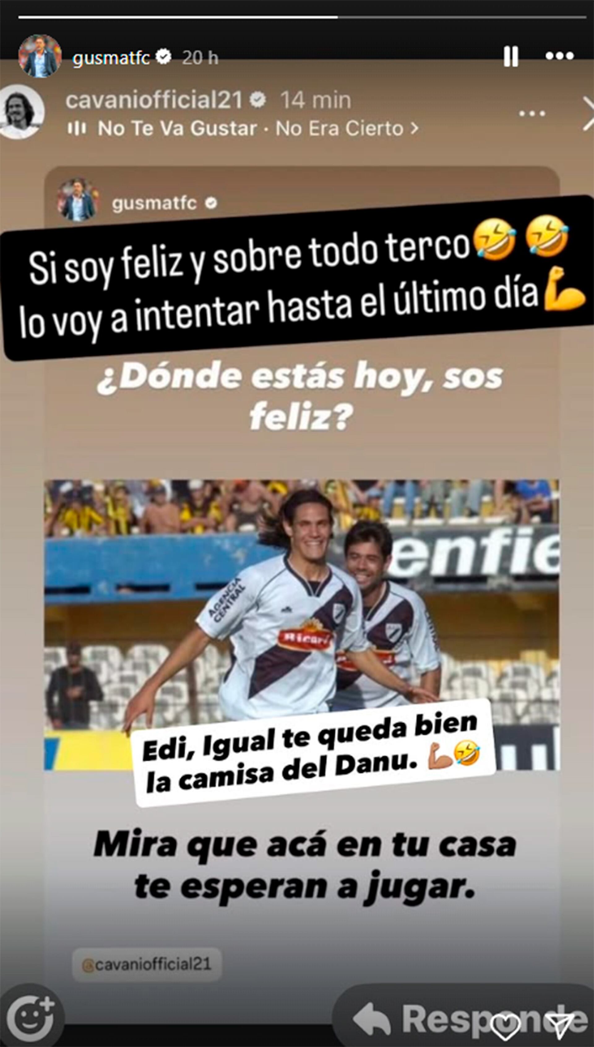 El posteo no pasó inadvertido y generó una respuesta inmediata de Cavani a través de la misma red social. El futbolista de 38 años, actual jugador del Xeneize, replicó la historia con una frase contundente: “Sí, soy feliz, y sobre todo terco. Lo voy a intentar hasta el último día”, acompañada de dos emoticones de risa. Con esto, el delantero dejó en claro su intención de seguir peleando por un lugar en el cuadro argentino, pese a su rendimiento irregular en los últimos meses. A continuación, el ex entrenador agarró el guante y, en ese momento, evitó seguir la polémica: “Edi, igual te queda bien la camisa del Danu”.