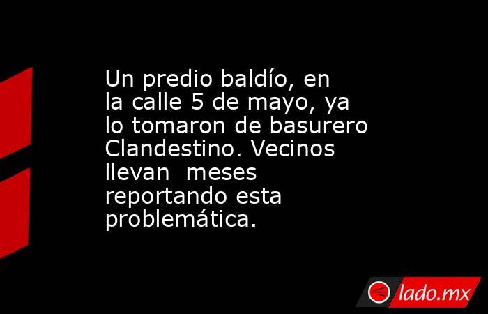 Piden a las autoridades correspondientes que atiendan esta problemática, pues de un tiempo a la fecha ya lo usan como un tiradero clandestino. Dicho predio se encuentra en la calle 5 de mayo, entre las calles Faja de Oro y Rafael Campuzano.