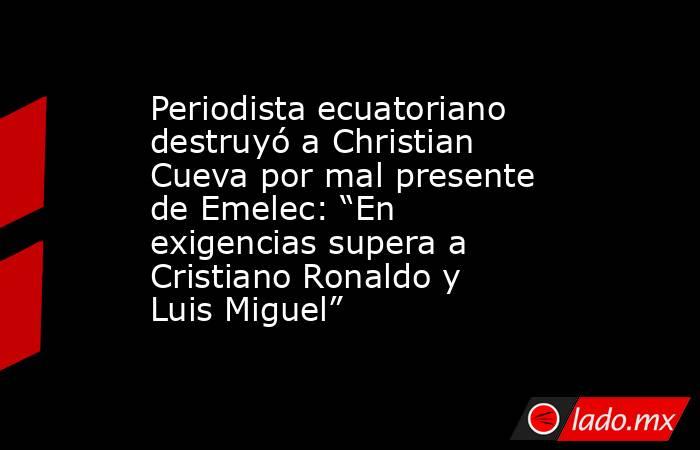 Christian Cueva se había convertido en noticia luego de anunciar su fichaje por Emelec de Ecuador tras haber rendido a un alto nivel en Cienciano, de la mano de Carlos Desio. Sin embargo, la situación del ‘bombillo’ no es la mejor y se encuentra en zona de descenso. Por tal motivo, las críticas han llegado sobre el equipo y el volante peruano. En ese sentido, Ricardo Vasconcellos, periodista ecuatoriano, destruyó a ‘Aladino’ por sus temas extradeportivos y exigencias.
